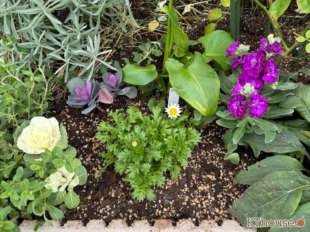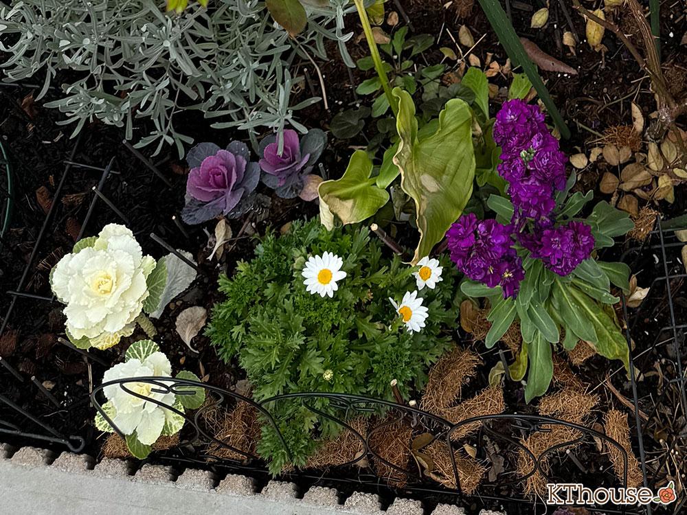 寄せ植えして残ったハボタン、香りの良いストックがある花壇に植え付けました。