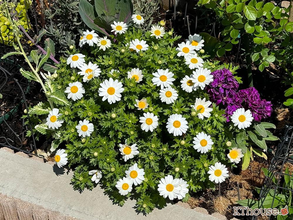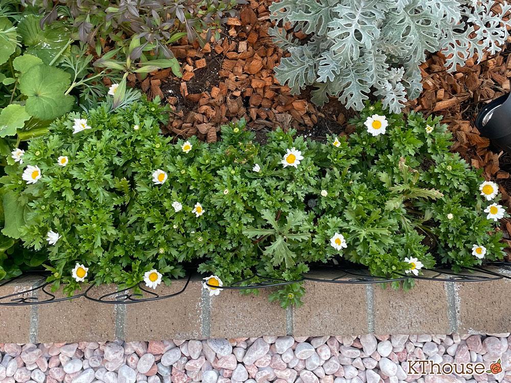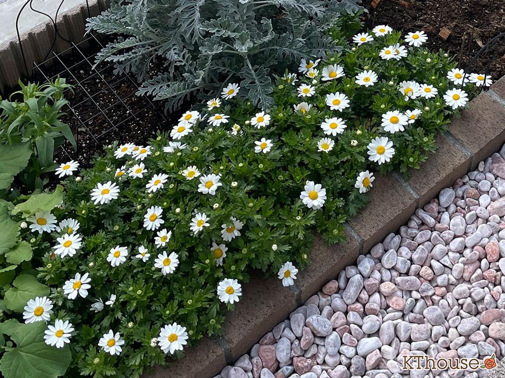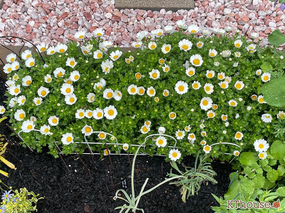 中心が鮮やかな黄色の白い小ぶりな花がぎっしり!花壇をとっても明るくしてくれています。