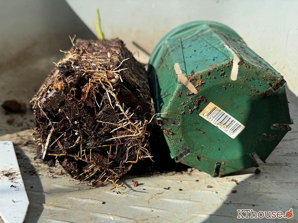 もっと育ってもらうために鉢増しをするため、二重鉢から出しました。スリッド鉢の底から根がはみでるほどではなかったですが、白根が結構出てくれていました。