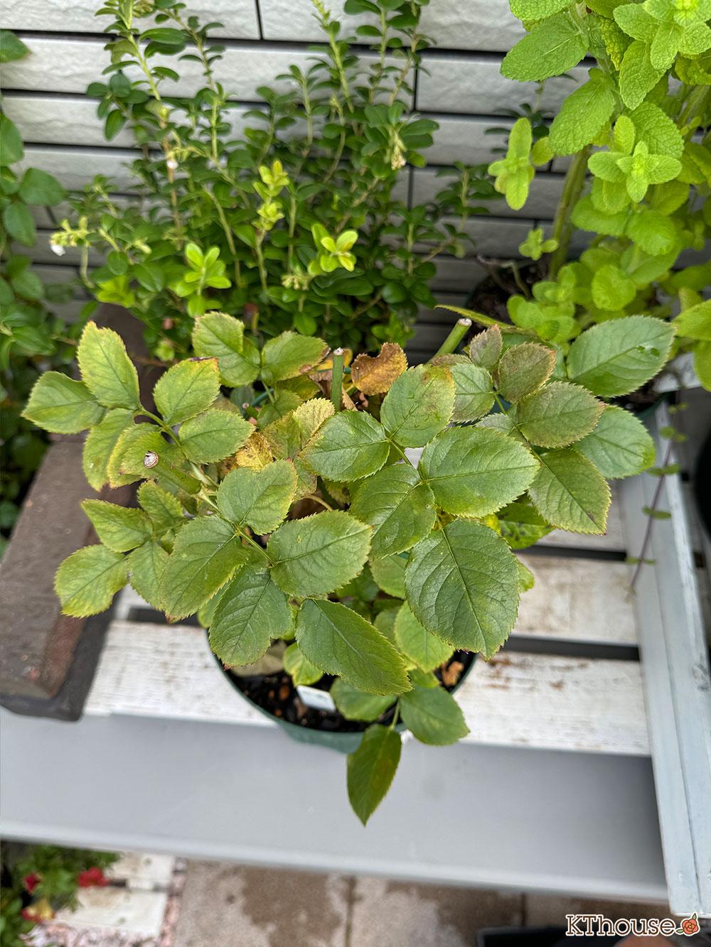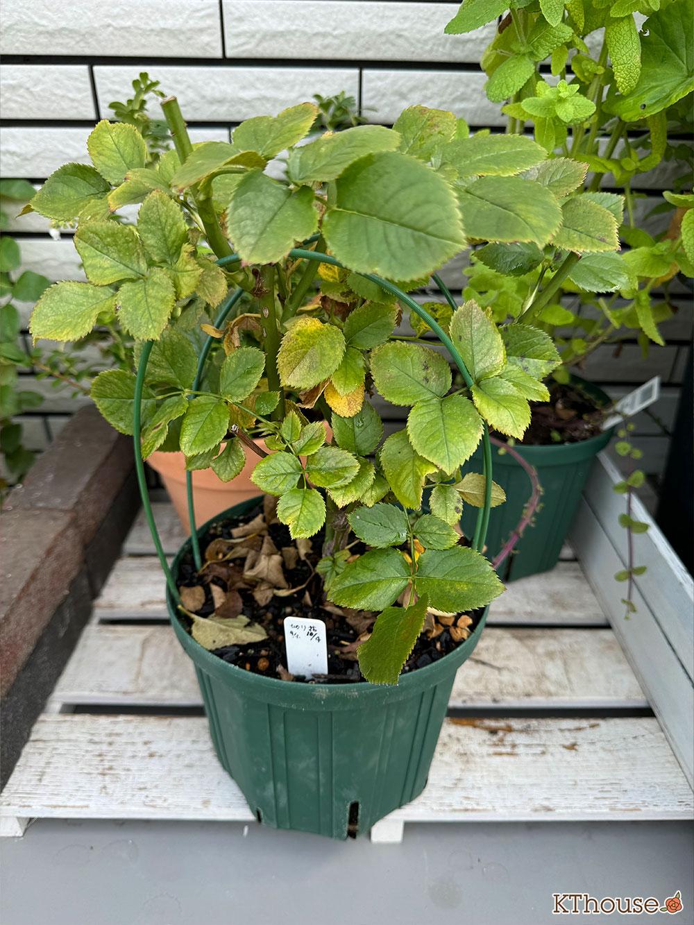 養生していたのですが、同じ環境のほかのバラ苗と比べてもどうも調子が悪そうで、葉っぱの色も悪くなっています。