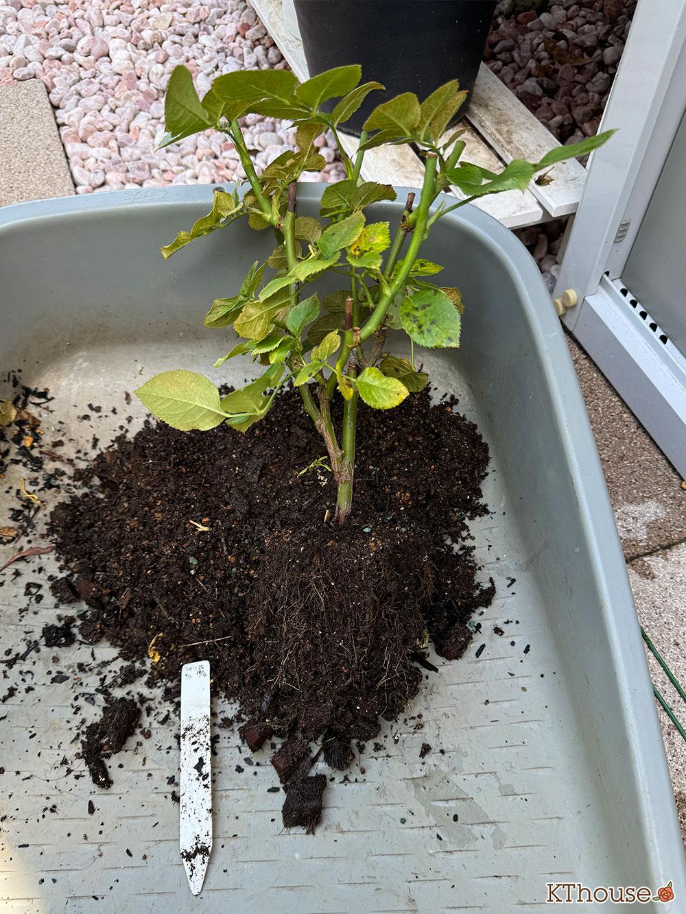 ビニールポットから同じ3号サイズに、バラ専用の培養土で植え替えました。