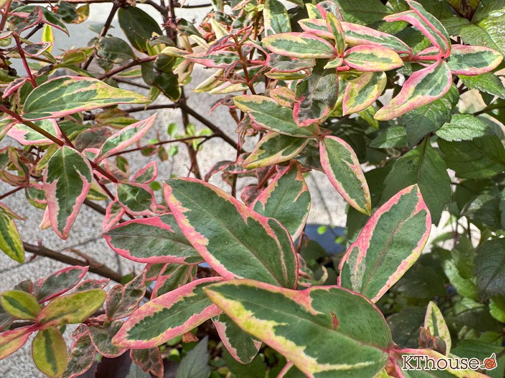 ヒペリカム・トリカラーは、緑・クリーム・ピンクの3色が混じった美しい斑入り葉(トリカラーリーフ)が最大の特徴の常緑低木です。
