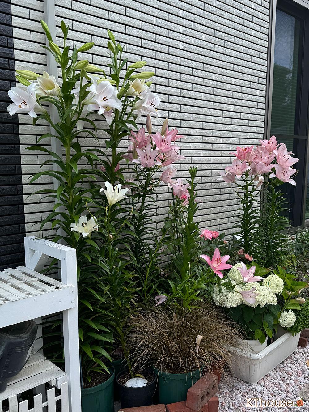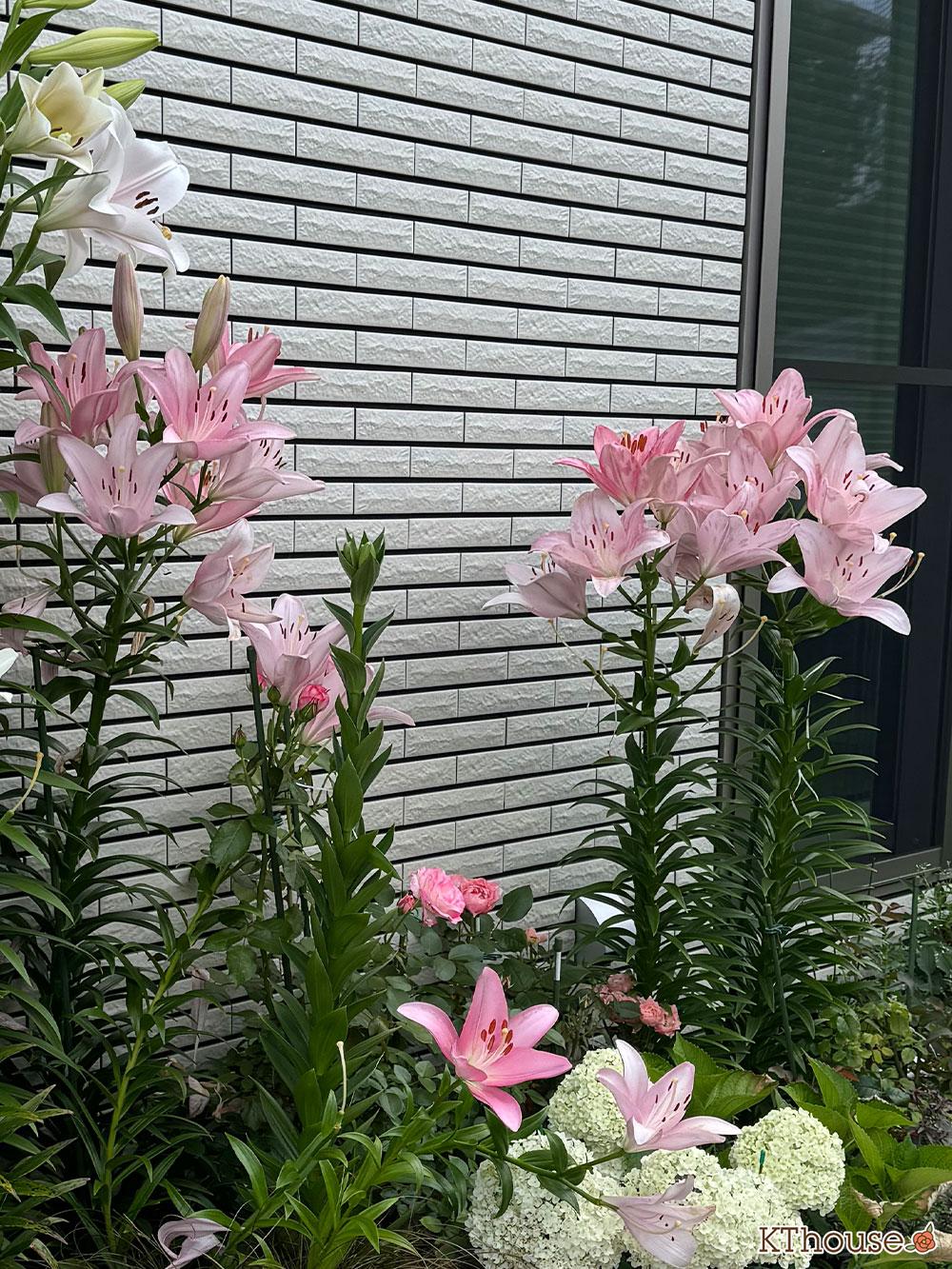 花壇の奥に白のユリを、手前側にピンクのユリを植えます。