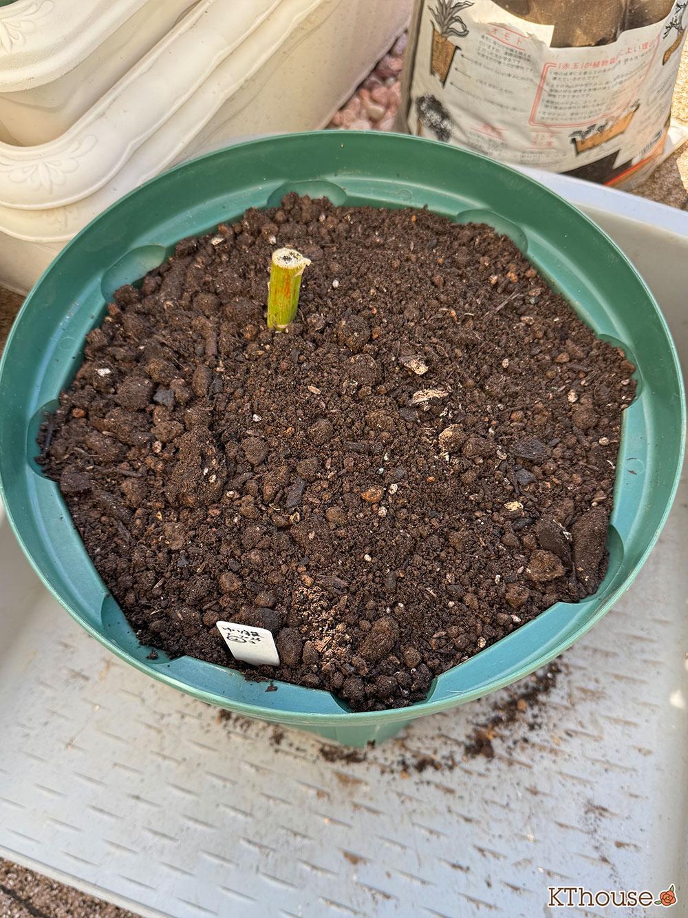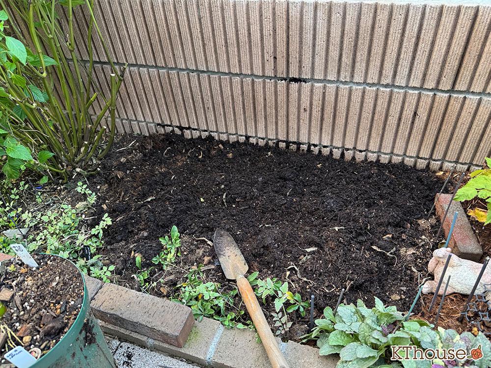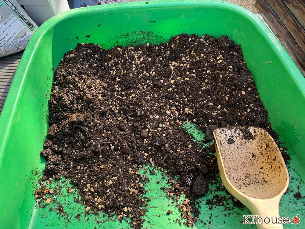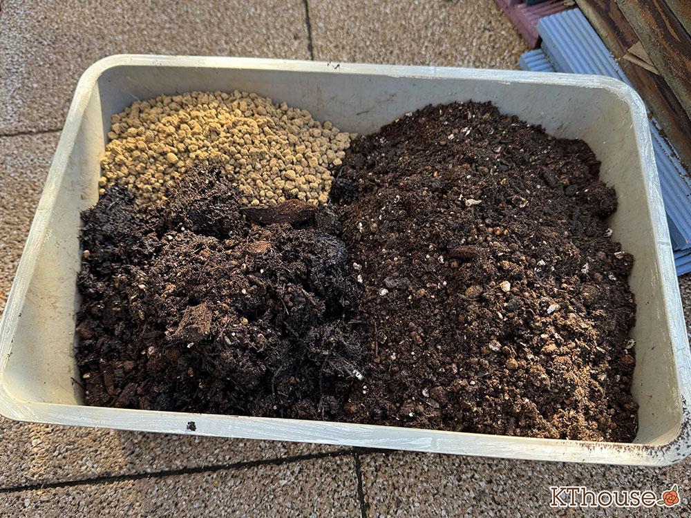 古い土をコンポストして再生させた培養土をメインに、保水力と排水力をアップさせるためにバーク堆肥入りの腐葉土と小粒の赤玉土を入れました。念のために土壌の酸度を調整するために有機石灰も少々入れました。