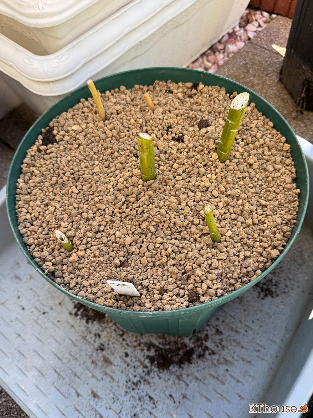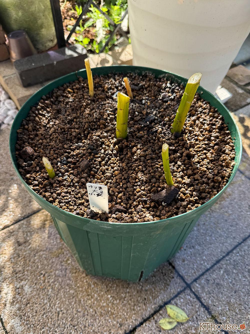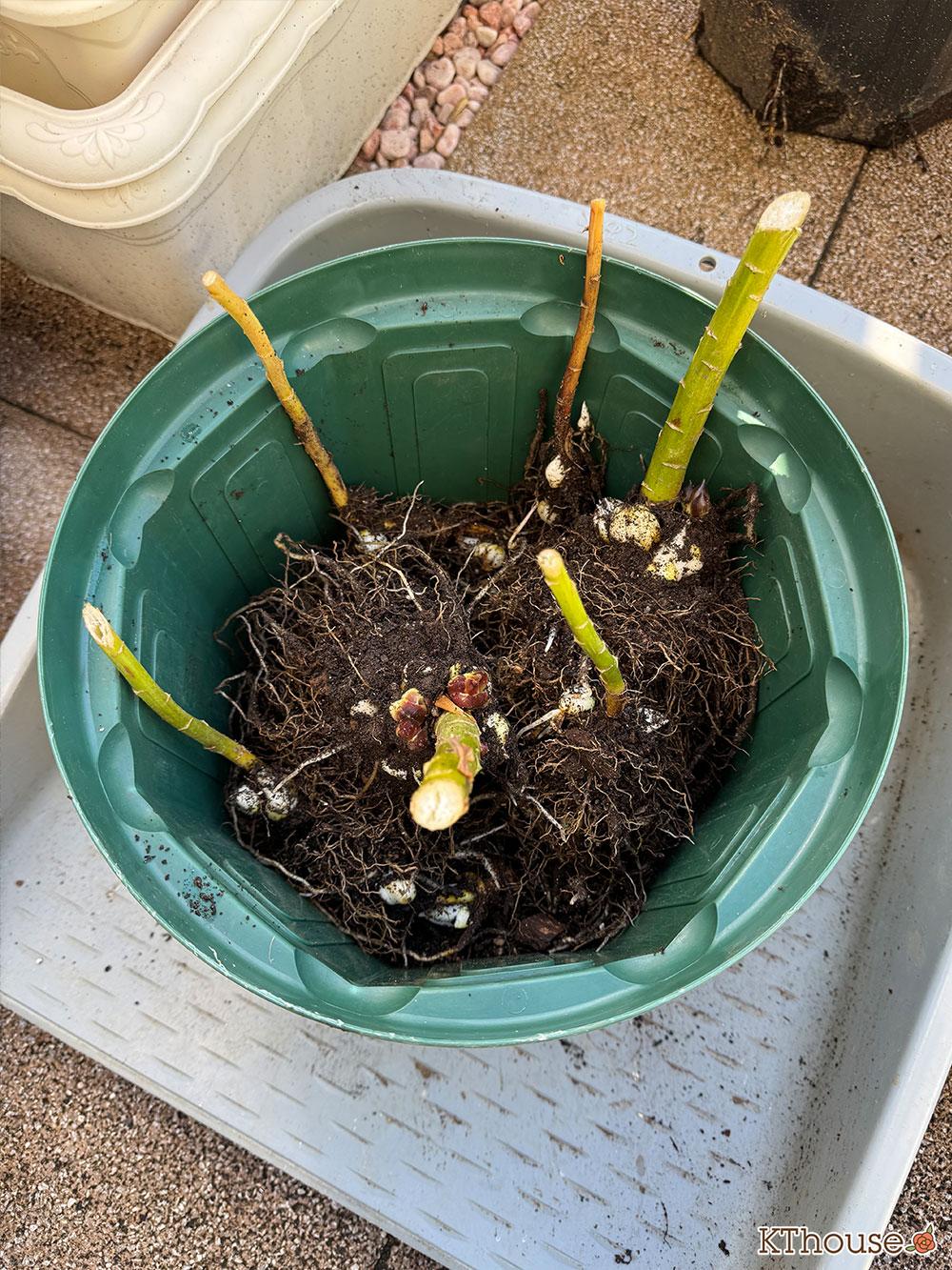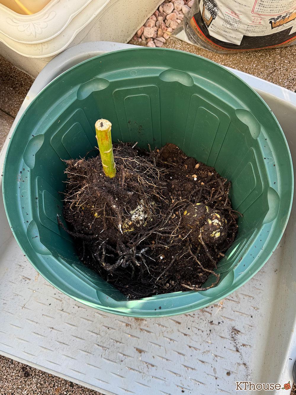 もう一つの大きい球根が2つの鉢も解体して同じように植え替えました。