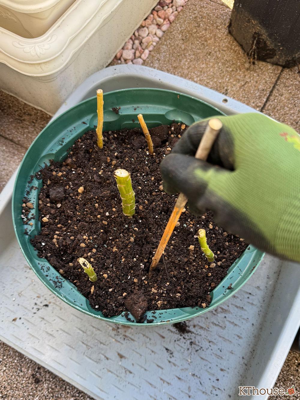 土を入れて、鉢のサイドをトントンと叩いたり、菜箸を使って球根を傷つけないように刺して、根に土がなじむようにしました。