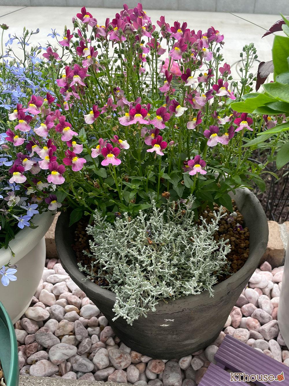 昨年寄せ植えに使っていた「シルバーブッシュ」が植わっていた鉢から一年草のパンジーを抜いて、今度は「PWネメシア」と寄せ植えをしました。